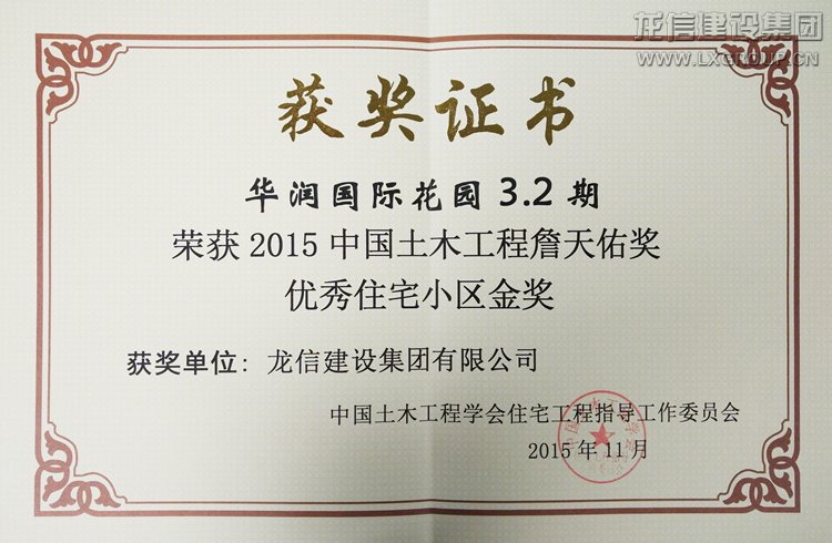 11月6日-8日,中國土木工程學會在北京召開“2015中國土木工程詹天佑獎優秀住宅小區技術交流會”,龍信建設集團有限公司承建的“華潤國際花園3.2期”項目榮獲2015年度中國土木工程詹天佑獎優秀住宅小區金獎,協會領導為公司頒發榮譽證書。